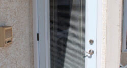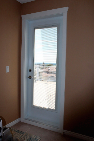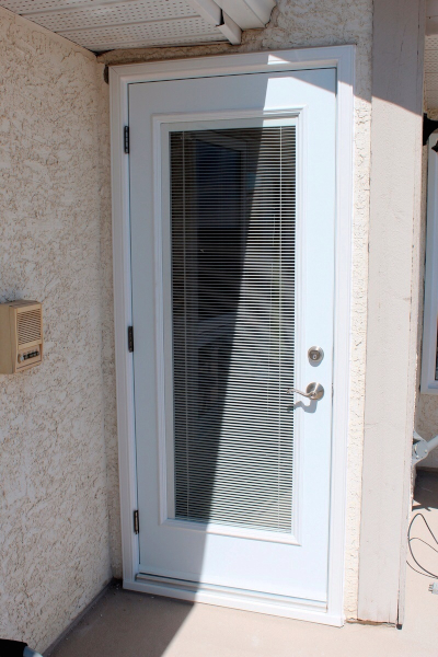 Door types installed: Insulated Steel Entry Door with sidelight and transom, French double door with internal blinds.